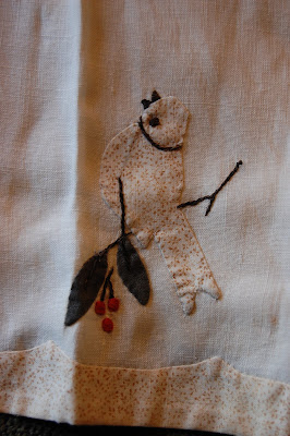 The last piece just makes me smile. I do love birds -- you saw my covered dishes with little bird handles recently. In my kitchen there are bird prints and plates, eggs, nests, and a beautiful bird's nest painting done by the lovely Donna, of Donna's Art. This little hand towel, with it's cheerful bird appliques, will fit right in.